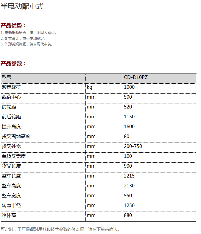 當(dāng)前位置:首頁(yè)>>產(chǎn)品展示>>半電動(dòng)堆高車>>CDPZ10系列1噸半電動(dòng)配重式堆高車